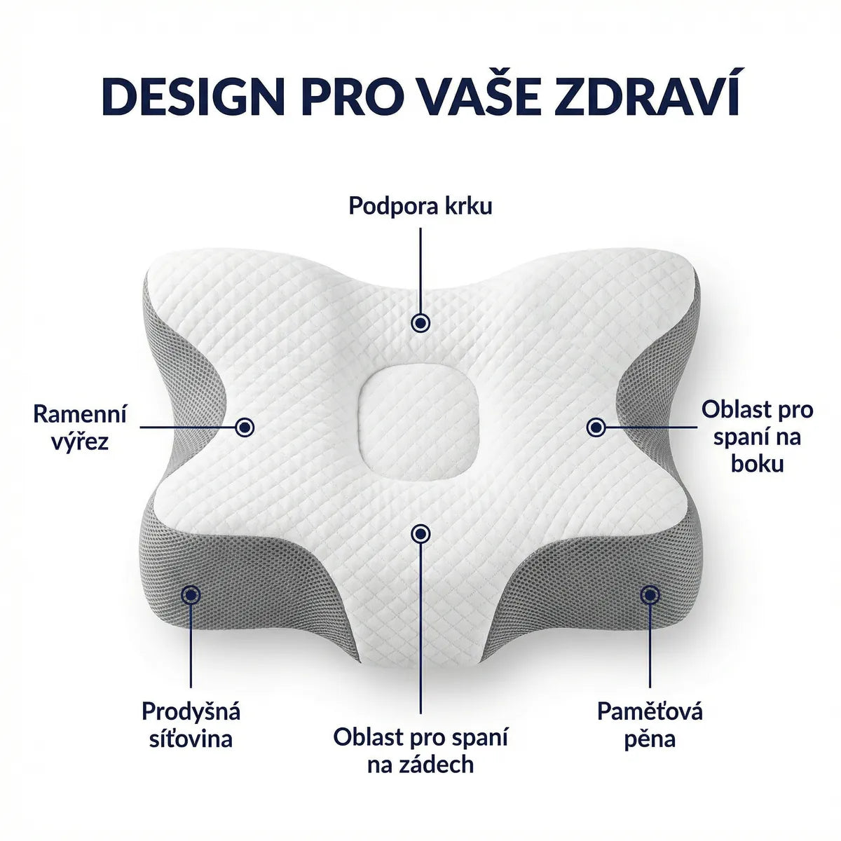 Jedinečný tvar „motýl" udržuje dokonalé vyrovnání hlavy, krku a páteře. Zlepšením postoje podporuje lepší noční dýchání — ideální pro snížení dýchacích obtíží a chrápání.